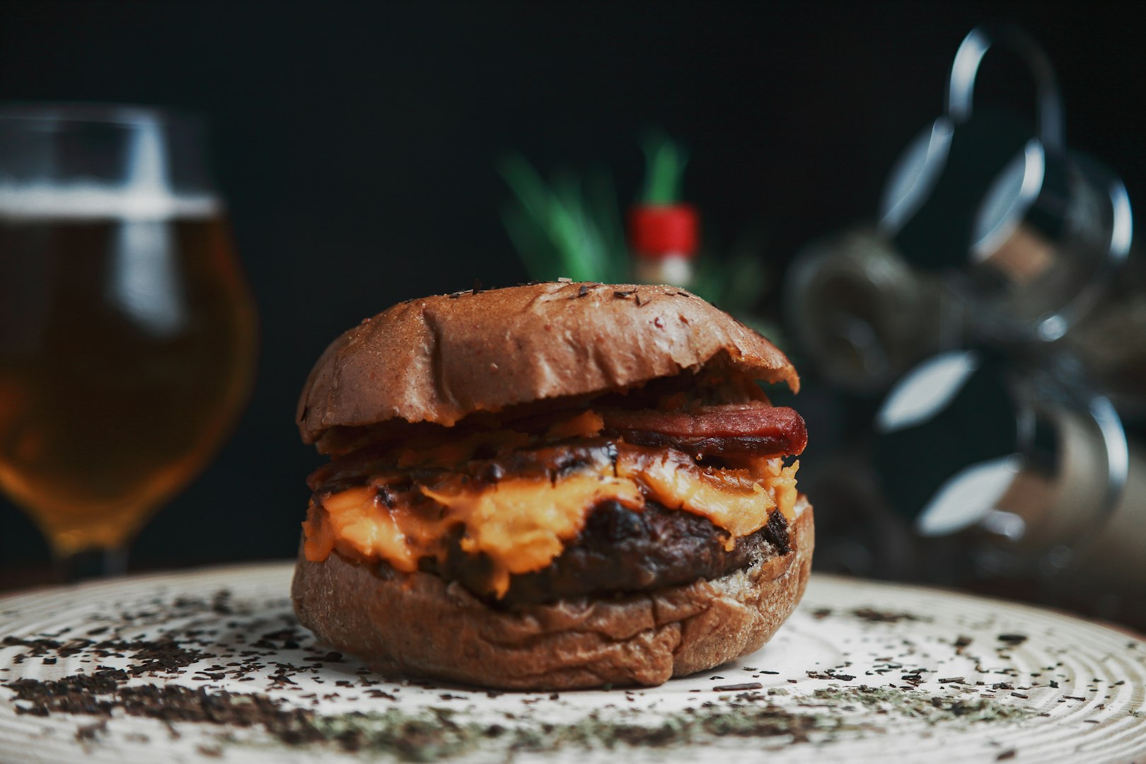 Cheese & Bacon burger, våra hamburgare kommer från Bjursunds slakteri, saftiga, god smak. serveras med pommes & parmesan